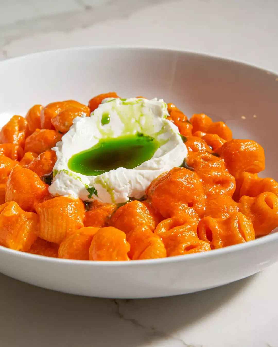 At Cento Pasta Bar, a pasta bar in West Adams owned by Chef Avner Levi, there is a unique Spicy Tomato Pasta. This dish uses al dente macaroni, paired with a rich Calabrian chili and truffle tomato sauce. There is a mound of whipped ricotta cheese on top, and a pool of green basil oil beside it.