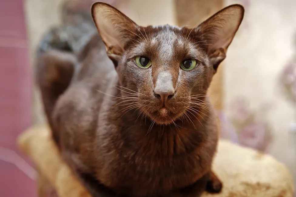 Medium-sized and muscular, the Havana Brown boasts a graceful physique with long limbs, a wedge-shaped head, and large, forward-tipped ears that frame its almond-shaped green eyes. Its short, satin-like coat is uniformly deep brown, extending seamlessly from the nose to the paw pads, with even the whiskers matching the warm cocoa tone. While British Havana Browns lean toward the slender Siamese build, American variants exhibit a slightly rounder head and longer fur, influenced by Russian Blue genetics.