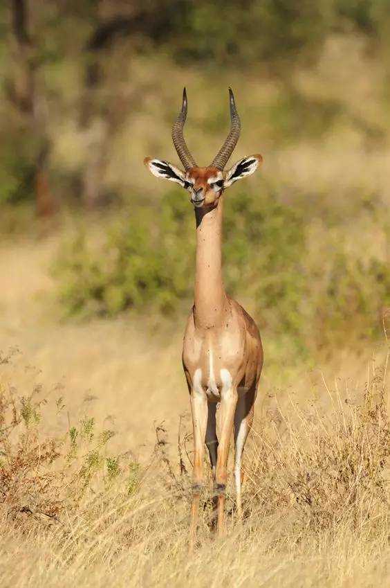 The gerenuk’s most striking feature is its disproportionately long neck, which can reach up to 60 centimeters—allowing it to browse on leaves, shoots, and flowers from trees and shrubs that other antelopes cannot access. Standing 80–100 centimeters at the shoulder, it has a lean body, large eyes, and small, backward-curving horns in males. Its skin ranges from light tan to reddish-brown, blending with dry grasses, while a white underbelly reflects sunlight. When feeding, it rears up on its hind legs, using its prehensile lips to pluck foliage—a behavior resembling a miniature giraffe.