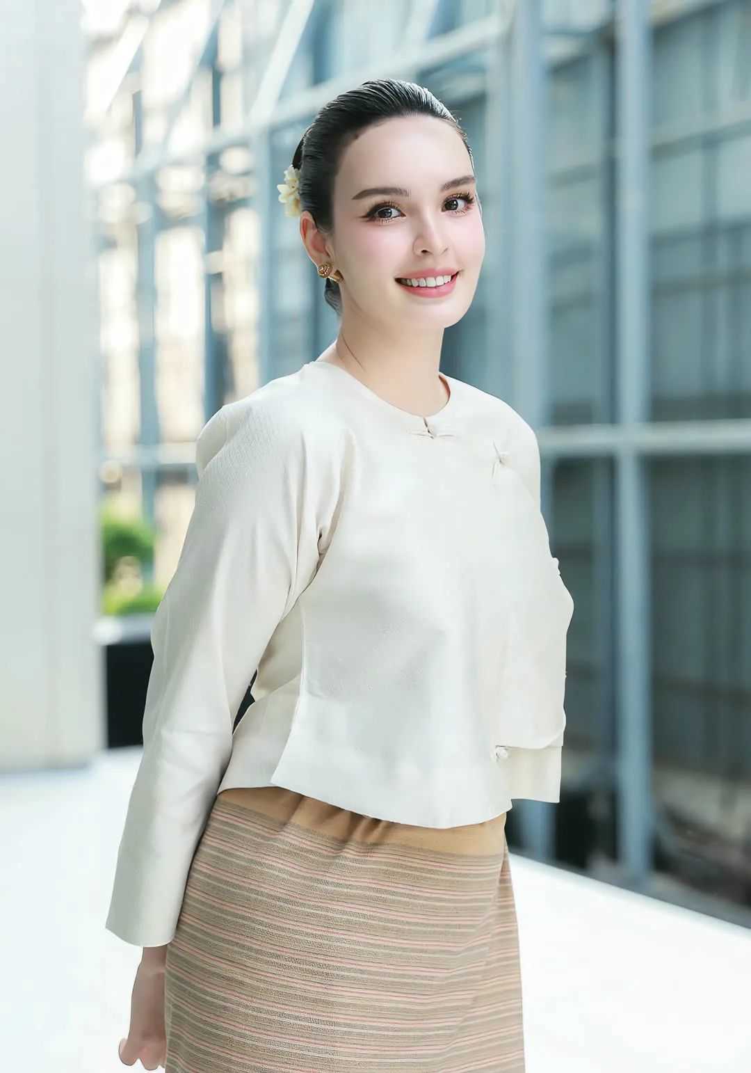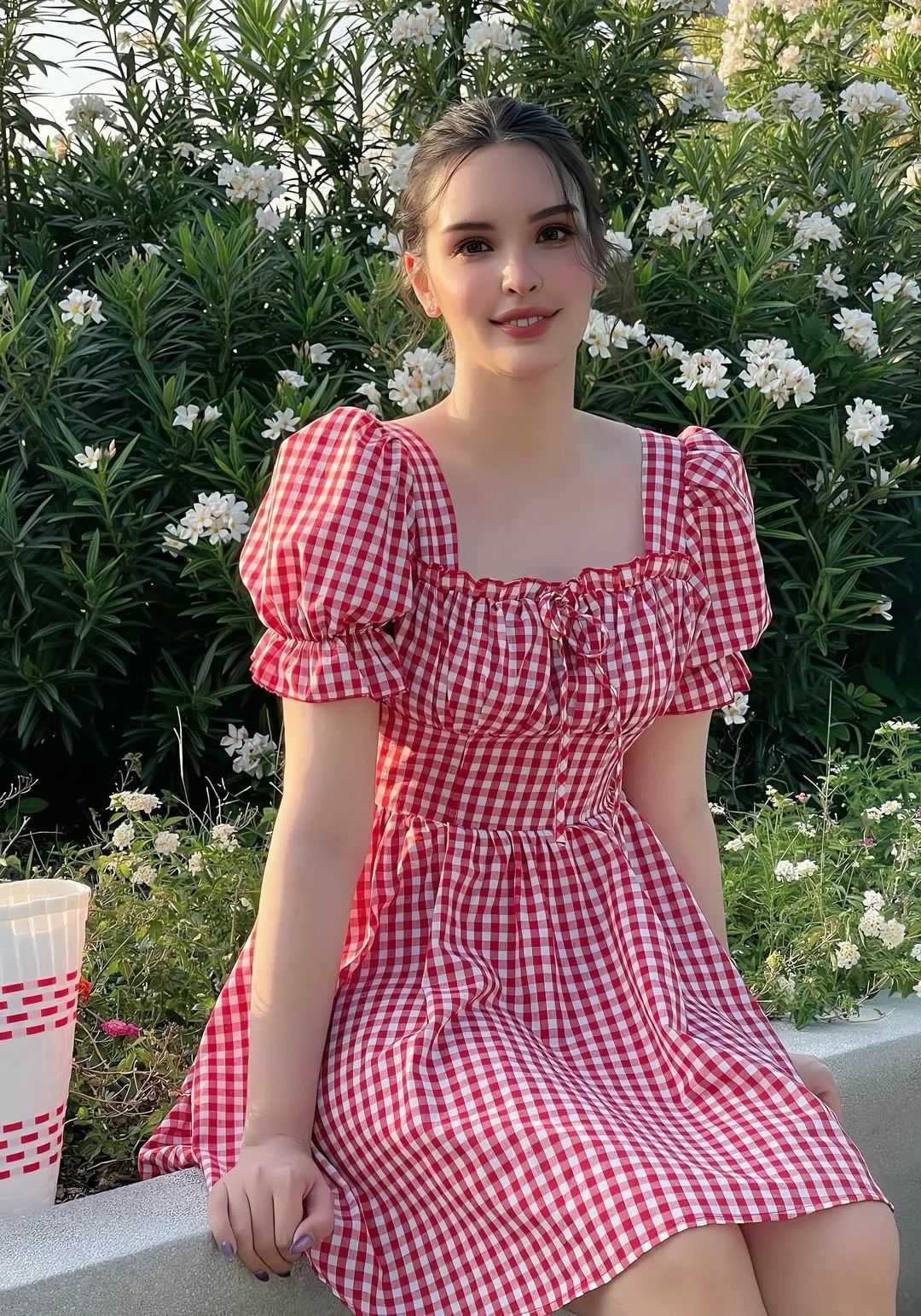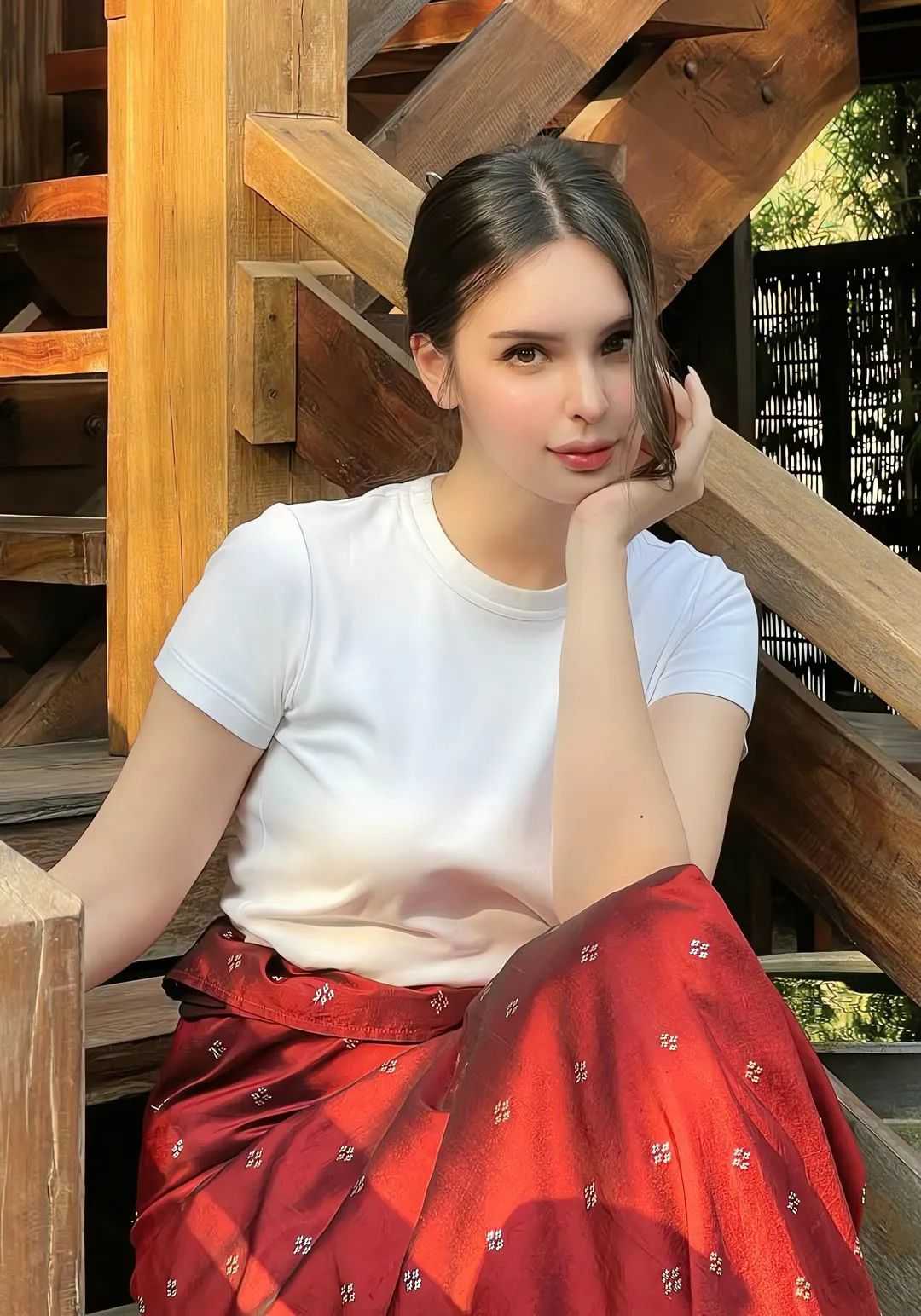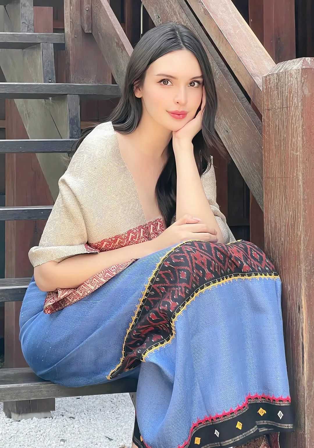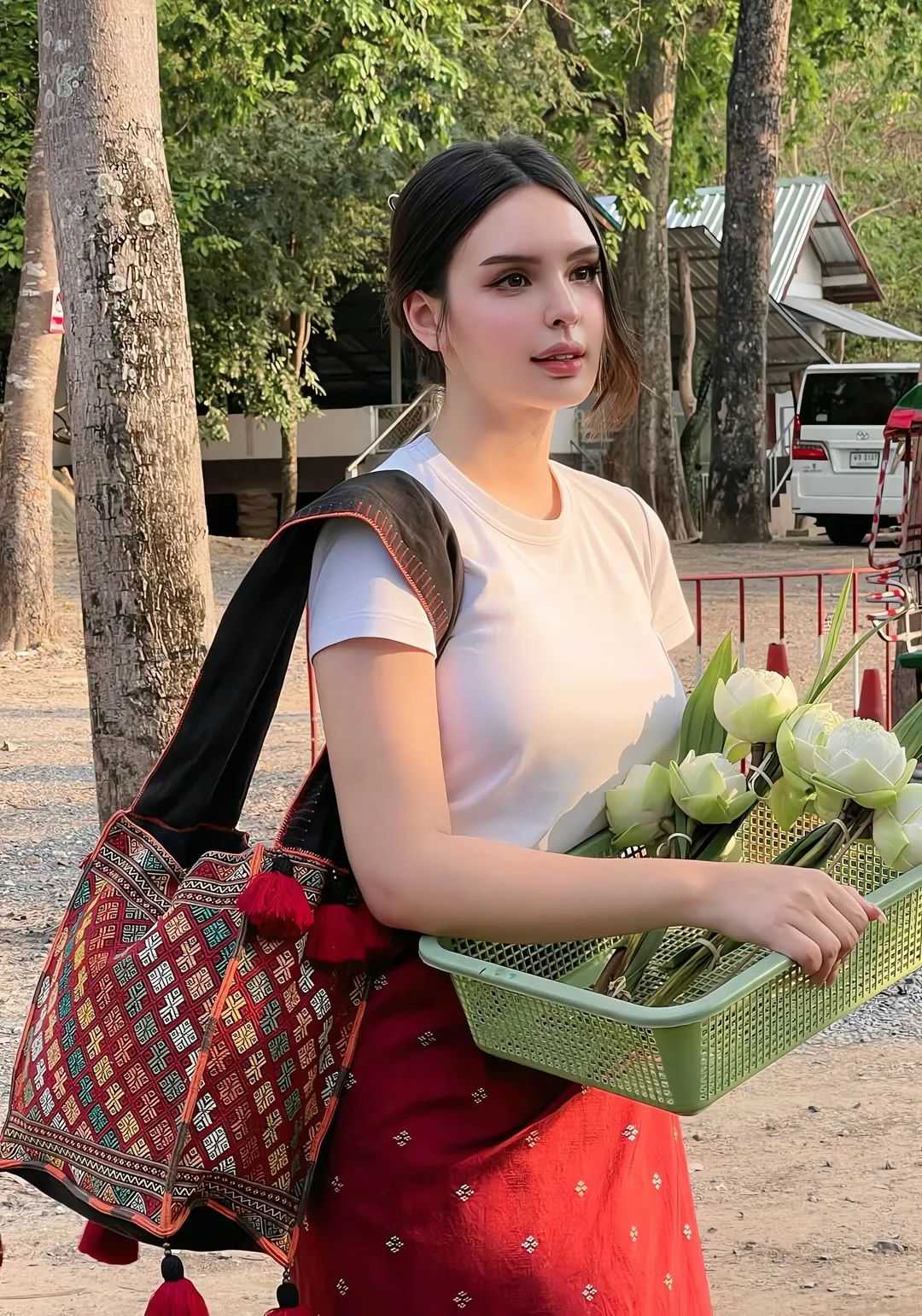 In a vibrant street market, the model pauses to examine colorful textiles, her casual denim jacket and sneakers contrasting with the vivid stalls around her. The chaos of the market fades into a blur as the camera focuses on her intrigued expression, a snapshot of curiosity in motion. Later, she poses on a concrete rooftop at dusk, the city skyline glowing behind her. Dressed in a minimalist black dress, she leans against a metal railing, her gaze distant yet anchored in the moment—a study in contrast between soft femininity and the city’s hard edges.